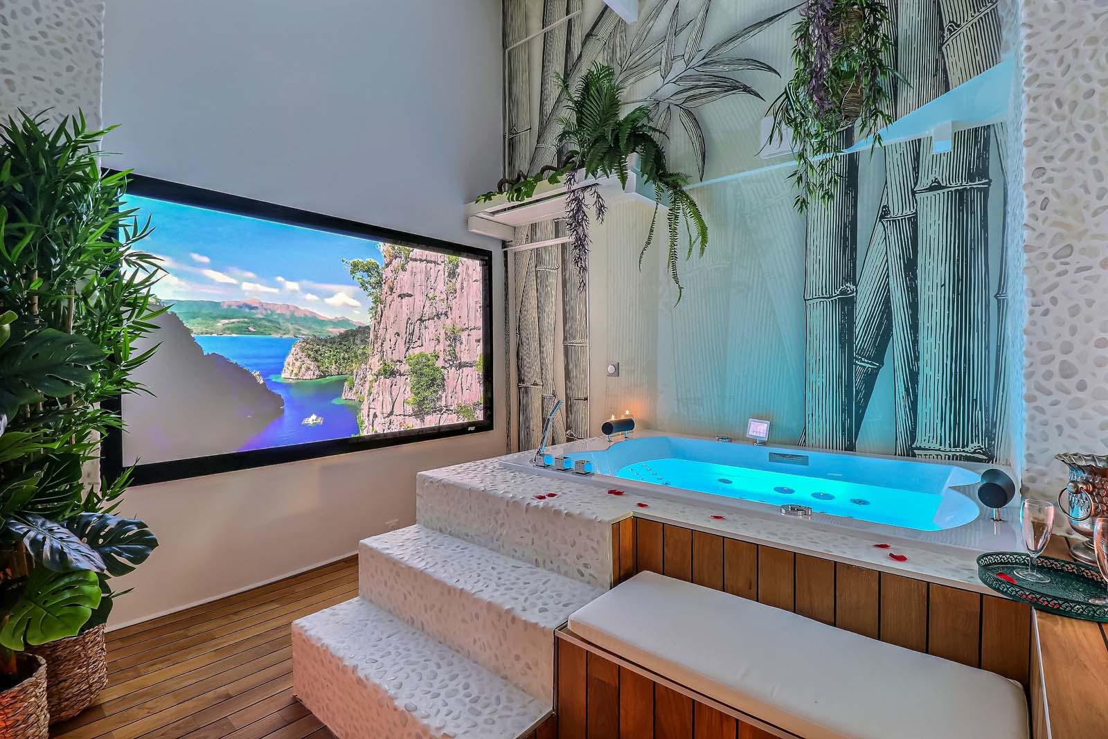 Ce SPA privatif est équipé d’un Jacuzzi haut de gamme avec 40 puissants jets d’hydromassage, d’un écran géant et d’un vidéoprojecteur laser.